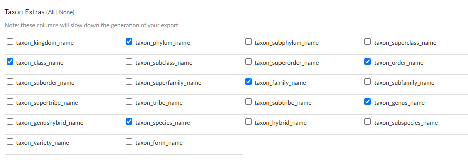 At the moment on the export page, we are lacking division options between genus and species - the only option I see is ‘genushybrid’. For the groups of taxa I work in, things like subgenus, section, and subsection are very useful for exports since many species are hard to get to species and end up research grade at one of these slightly higher divisions - that extra division is more informative than everything being just shown at genus, and it would be very useful to have these extra options