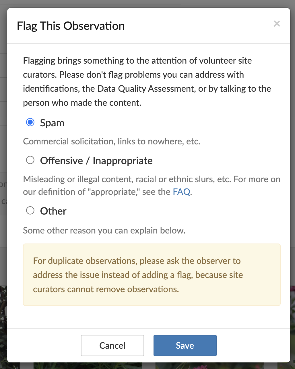 Step 3: Notice that the “Save” button is cut off the bottom of the screen, making it impossible to submit the flag. It appears that when AI was added as a flagging reason, it pushed the bottom of the flagging popup below the bottom of the screen, leaving the “Save” button inaccessible. This is only a problem when flagging observations, when you flag media or comments the paragraph about duplicate observations is not present, making the popup small enough that it still fits.