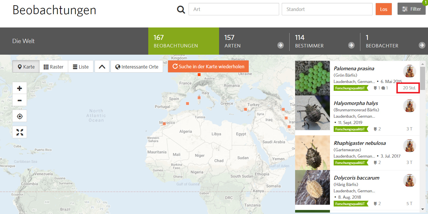 I go the inat homepage and click on “Beobachtungen”. It is the first observation, added today.