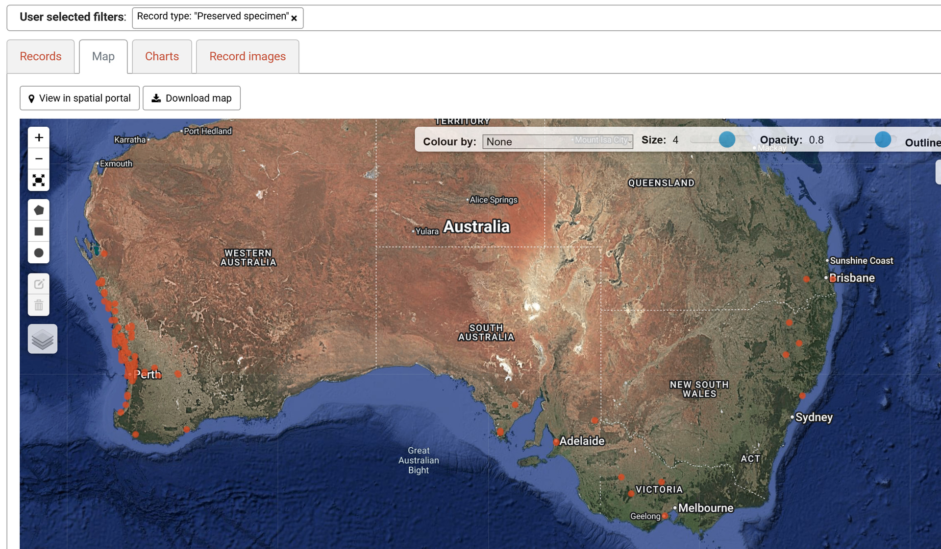 The following map from the ALA shows herbarium vouchers of the plant species Chamelaucium uncinatum, which occurs naturally only in Western Australia.