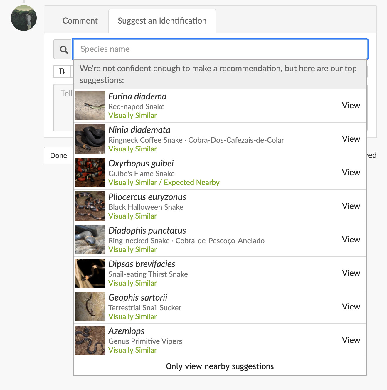 Step 2: Toggle between “ignore location” and “use location”. Regardless of what is selected, the top suggestion is of Furina diadema. The problem is that this is a species that is not found in South America, and the geomodel does not predict it outside of Australia. The third suggested species, Ninia diademata is only expected in Mexico and Central America. The fourth, Pliocercus euryzonus, is also not expected anywhere nearby, and so on. This is not, therefore, an issue with a single species or with the geomodel, but with how the computer vision suggestions are being filtered for display.