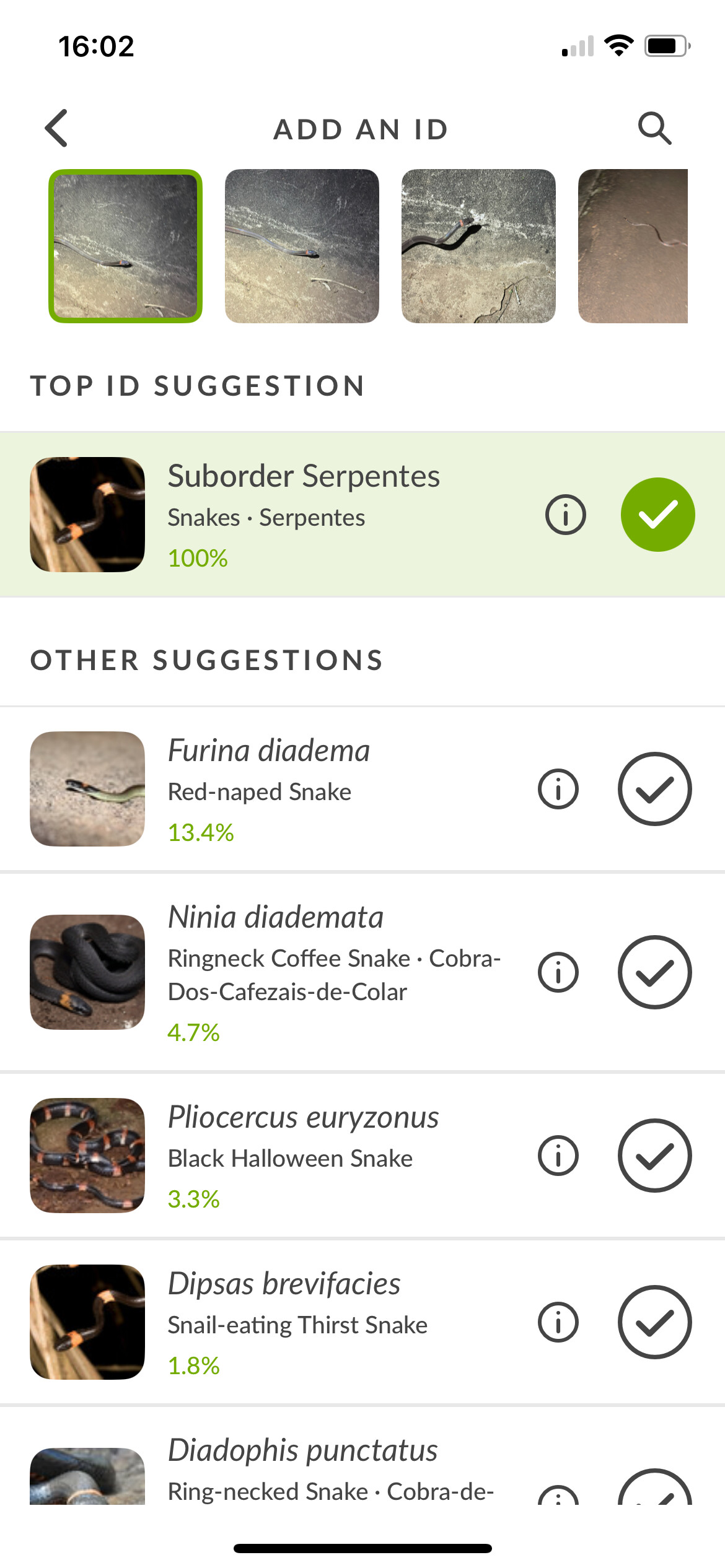 The one species that is in fact “expected nearby”, according to the web interface (Oxyrhopus guibei, which is legitimately expected locally) appears in second place when filtering by location on iNat Next, but does not appear in the top ten at all when location is ignored. It appears in third place on the web interface. Does this indicate that the location filtering, rather than being “in” or “out” is applying some sort of weighting system that is going wrong in the app?