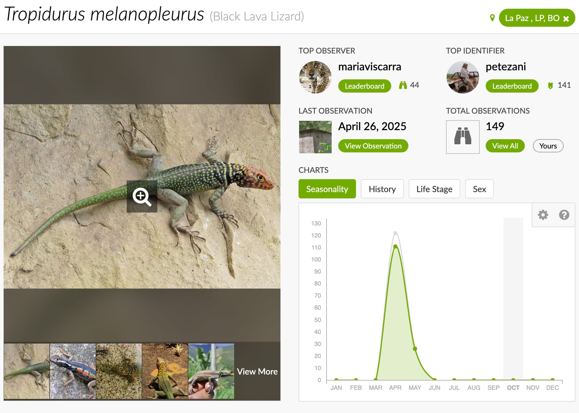 Observations of species near La Paz, Bolivia, are a great example here because La Paz is annually near the top of the leaderboard in CNC observations. The examples I use here are lizard examples mostly because April is fall in the southern hemisphere and so observations don’t correspond to the spring increase in activity of lizards, which probably happens in September or October. These species only have a couple hundred observations, which also helps make the distortion more obvious. In both examples below, observations in the La Paz region outside the CNC are fairly low to non-existent.