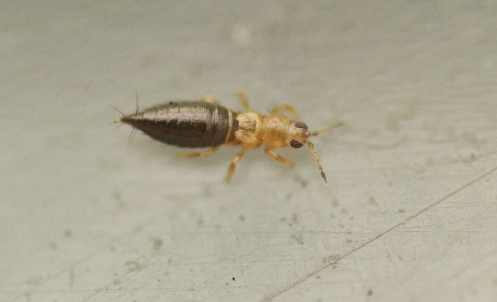 I guess this one, which is a Frankliniella fusca, or better known as the Tobacco Thrip. Seems to be the only observation of it on INat in the world. (https://www.inaturalist.org/observations/298470712)