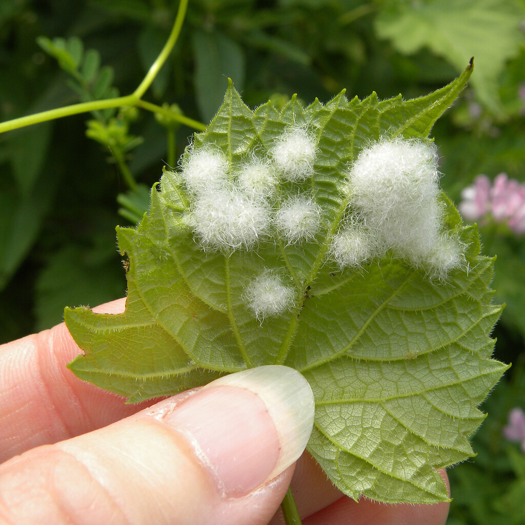These insect galls look like someone hot-glued cotton balls onto a grape leaf. I took a wild guess at what they might be (Genus Vitisiella, Grape Midge Galls), but regardless, they’re something I’ve never seen before.